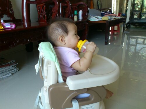 Tình hình ăn uống của em khá hơn tháng rùi chút xí, em ngồi ghế lâu hơn, ăn nhiệt tình hơn chút, nhưng vẫn ít lắm, tự bốc hoặc đút gì thì hơi nhiều xí là em ngậm, nên mẹ ko ép, thấy em ngậm tình tang trong miệng là mẹ dẹp đồ nghề liền, hy vọng tháng sau em ăn tốt hơn nữa. Em ko lên cân, vẫn u như kỹ, nên nhìn em thon thả hơn trước.