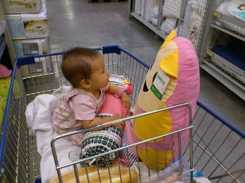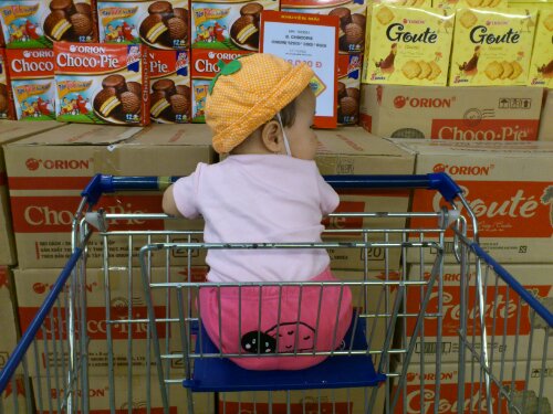 Em hay được đi siêu thị, và thường xuyên được mí cô chú (lạ hoắc) trong đó nựng nịu, hihi, em cũng vui vẻ cười hoặc nói chuyện đáp lễ 8-x
