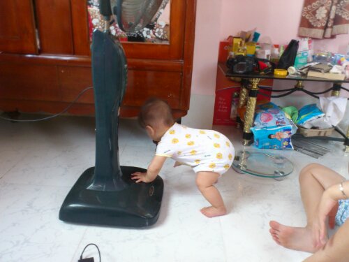 Trong tháng thứ 8 này em chỉ có mỗi việc bò và bò…. em bò lung tung, và em phá kinh khủng :* À, em còn thích đi chơi nữa, dì út Quỳnh tặng em cái khẩu trang nhí để tránh bụi, em rất lịch sự, lúc đeo vào em ko phản đối, nhưng tí sau là em giật ra, lần nào cũng như lần nấy, haizzz….
