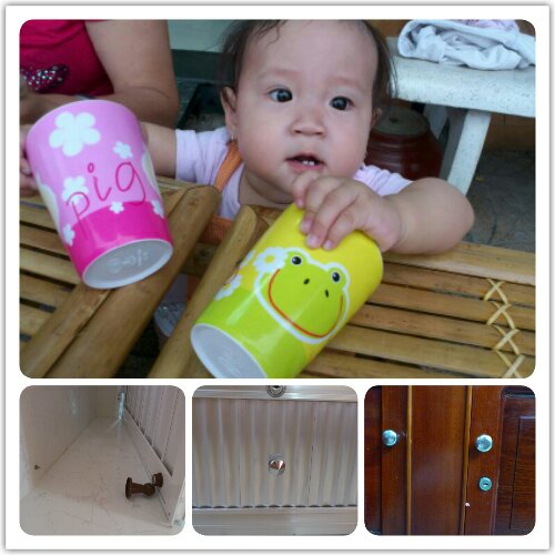 Bên cạnh tuyệt chiêu nhất dương chỉ mà mấy tuần nay nàng chăm chỉ luyện tập mọi lúc mọi nơi, nàng ta vừa luyện thành công tuyệt kỹ “vặn các loại nút/nắp…” hễ cái nào người lớn vặn vô thì nàng ta vặn ra rùi vứt lung tung, mấy cái núm kéo ngăn tủ đã đành, đàng này đến cái đồ nam châm giữ cho cửa mở ko bị đập đóng lại nàng cũng vặn ra rùi liệng đi, gắn lại vừa xong, qua quay quay lại là thấy nó nằm chỏng trơ giữa nhà nữa >:)