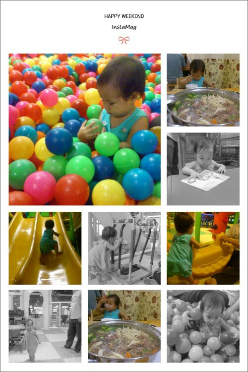 Sinh nhật mẹ là hôm qua cơ, nhưng vì ba đi làm nên qua hôm nay mới đi chơi. Đây là lần đầu tiên con được vô khu vui chơi của trẻ con trong siêu thị, lần đầu tiên chơi nhà banh, hi hi, nên lúc đầu con rất căng thẳng, sợ sệt. Nhưng lát sau quen chỗ rồi thì con bắt đầu chạy lung tung làm ba chạy theo muốn nghỉ thở =)) Sau đó cả nhà đi ăn món Hàn quốc để mẹ hồi tưởng lại kỷ niệm xưa, ha ha