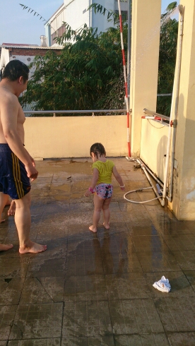 Ba mẹ rất hài lòng về điều này, he he, lần đầu tiên nàng thích 1 thứ có lợi cho sức khỏe =)) còn lại thì là đi ngựa, cho cá ăn (bánh mì, hự hự), ăn kem… 😀