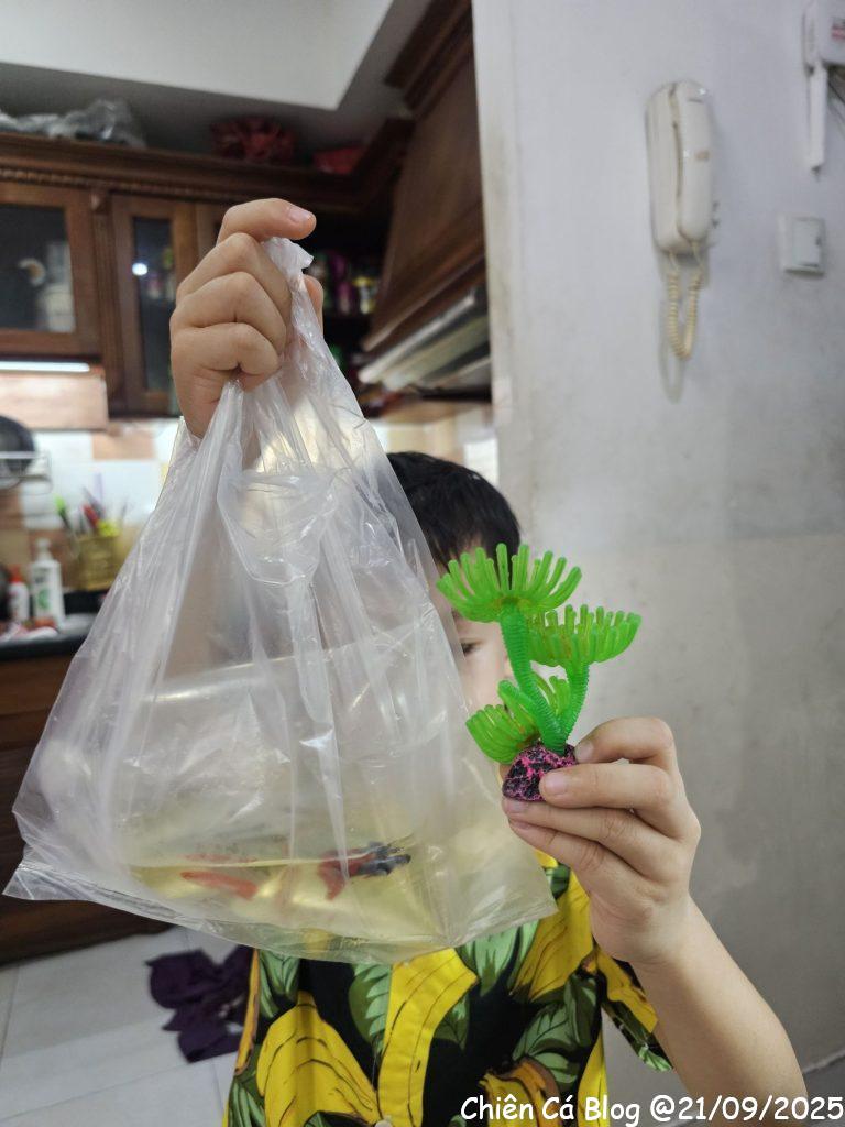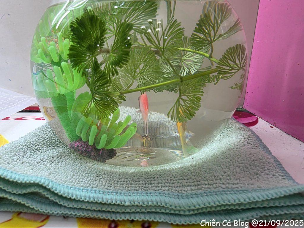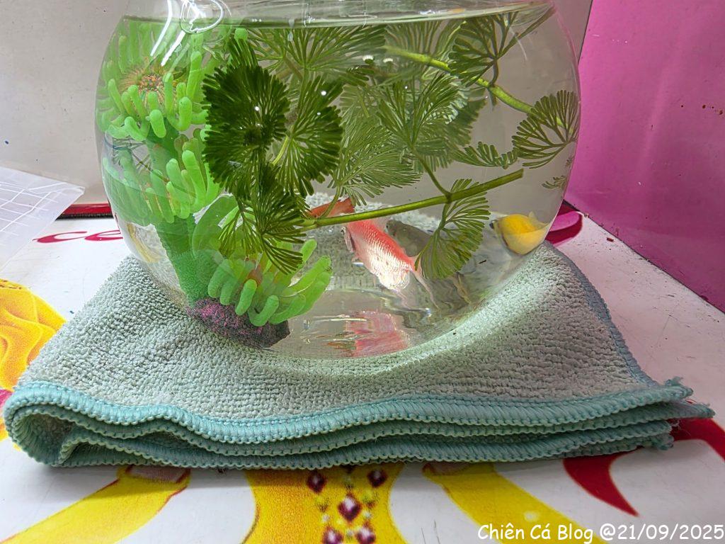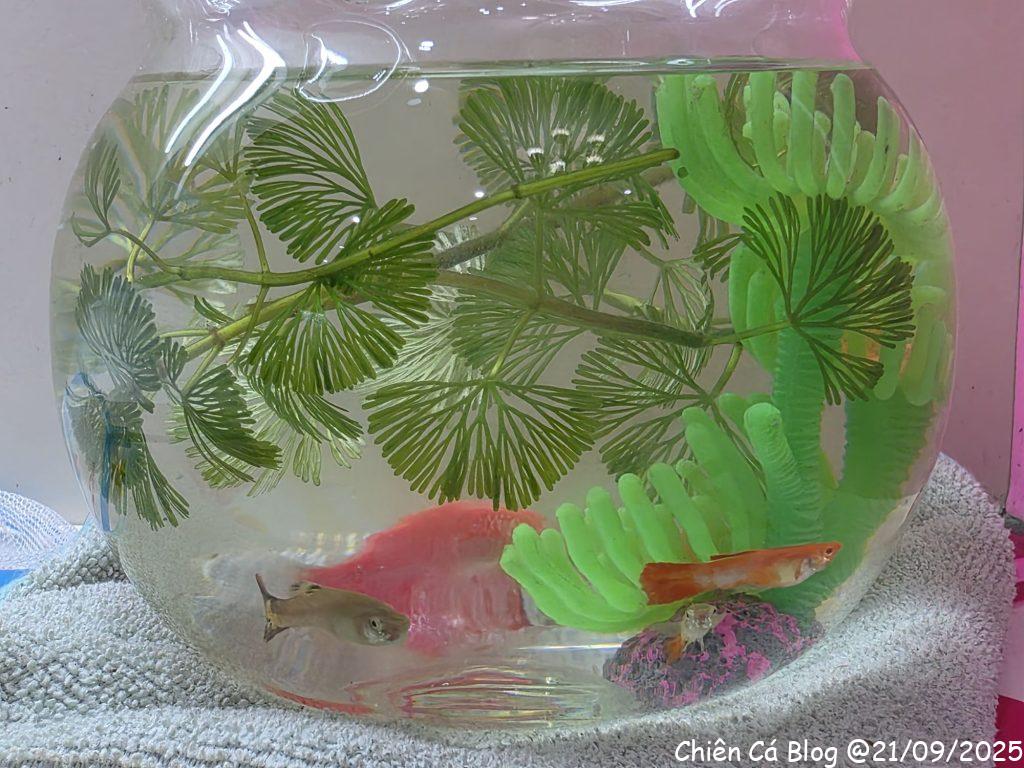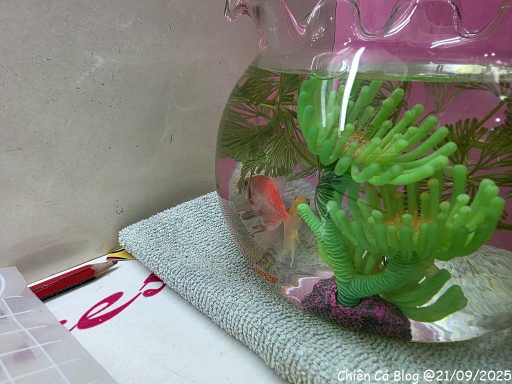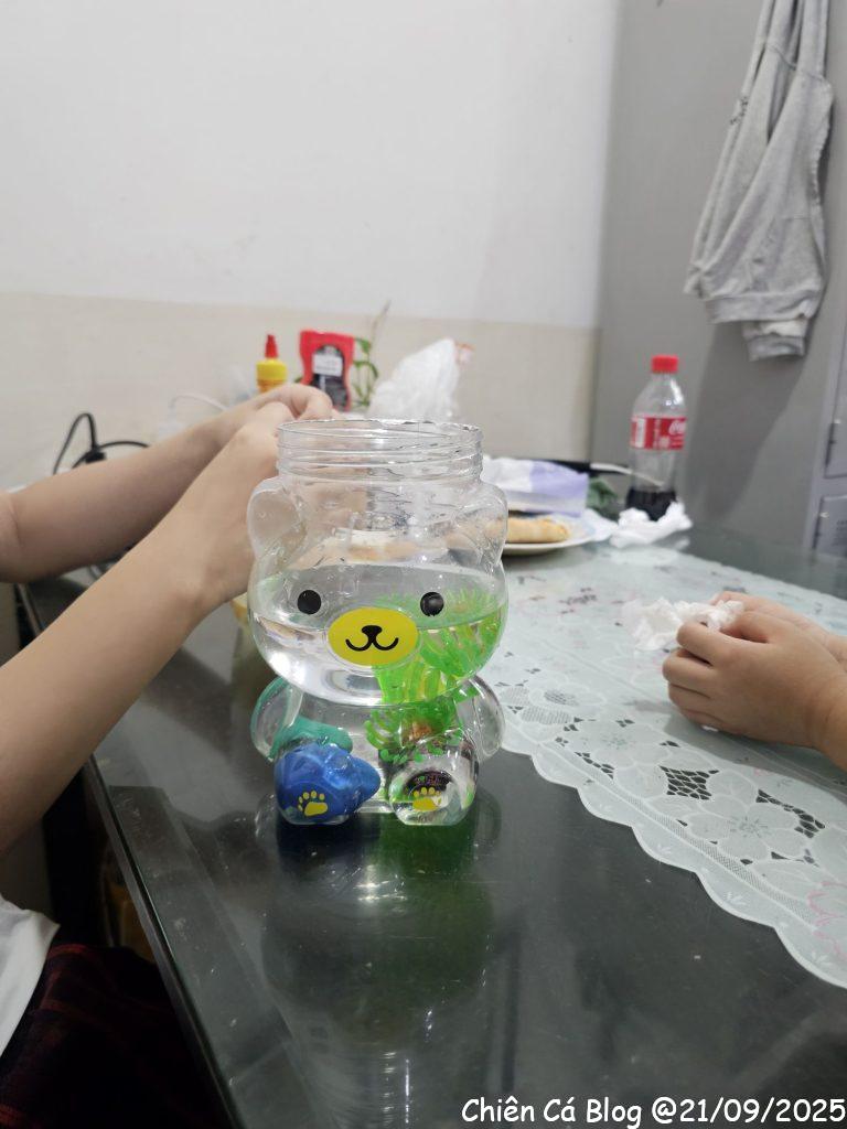 Bà Thanh thấy em nuôi cá nhìn nghiệp dư quá, nên về nhà lấy chậu cá, hốt thêm vài em cá xinh xinh khác đem qua cho em Cá nuôi tiếp, nhìn chuyên nghiệp hơn hẳn so với cái hộp kẹo hình gấu =)) trộm vía nghìn lần từ từ bữa đó tới nay mọi thứ đều đang yên ổn…